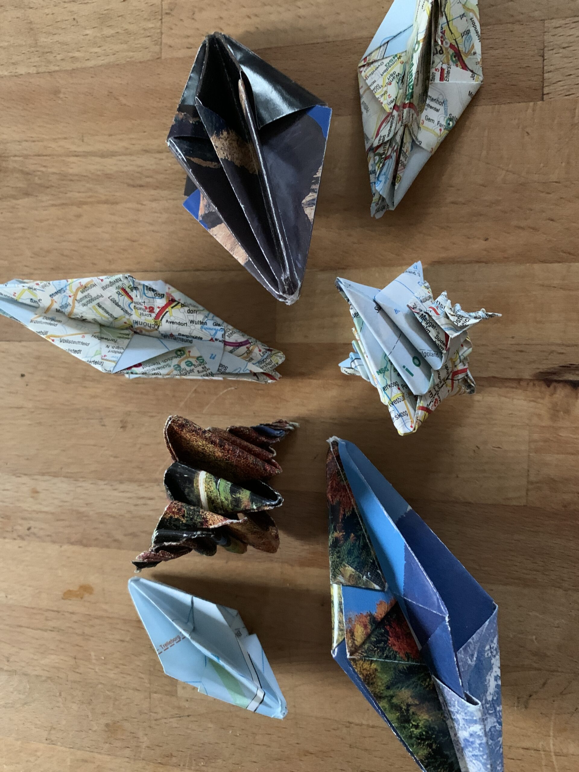 Heute hast du die Möglichkeit aus alten Kalendern und Straßenkarten Origami-Ornamente zu basteln. Anleitungen und Material sind vorhanden..